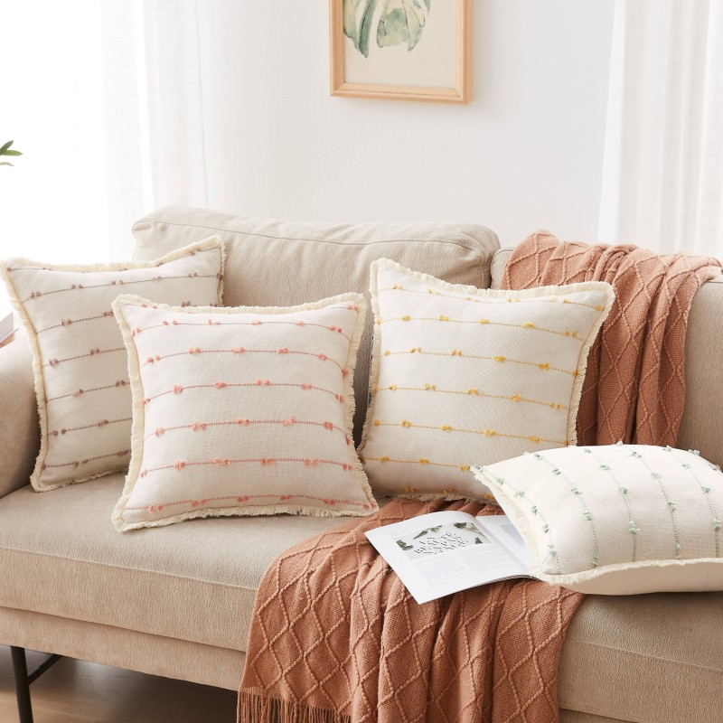FUNDA DE COJÍN PARA CAMA, SOFÁ Y EXTERIORES CON PATRÓN DE RAYAS HORIZONTALES DE COLORES Y TEXTURA DE HILOS NATURALES Y FLECOS IDEAL PARA ESTILOS BOHO O MODERNOS.