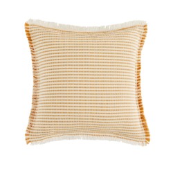 FUNDA DE COJÍN DE ESTILO BOHO PARA CAMA, SOFÁ Y EXTERIORES, CON PATRÓN DE RAYAS TEXTURIZADAS, HILOS NATURALES Y FLECOS, QUE APORTAN A LA ESTANCIA UN ESTILO FRESCO Y VERANIEGO.