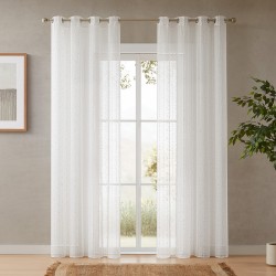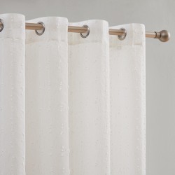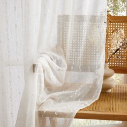 SU DISEÑO LIGERO Y ELEGANTE INCORPORA UN DELICADO MOTIVO DE PUNTOS TIPO POMPÓN, APORTANDO TEXTURA Y UN ESTILO SUTILMENTE DECORATIVO. SU TEJIDO CON EFECTO LINO PERMITE EL PASO SUAVE DE LA LUZ, CREANDO AMBIENTES LUMINOSOS, NATURALES Y ACOGEDORES.